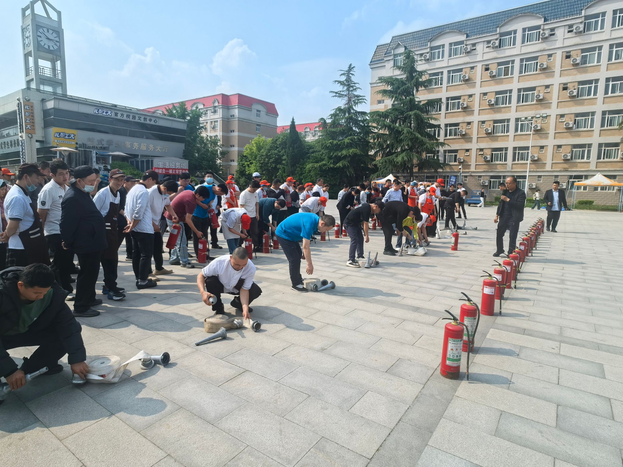 实战演练阶段在钟楼广场进行。在专业人员的指导下,大家分组开展灭火器“提、拔、握、压”四步操作及消防水带连接铺设实操练习,逐一上手体验,确保人人会用、遇险不慌,真正将理论知识转化为应急处置的实战本领。知味、知雅餐厅全体参训人员按照应急预案要求,模拟火情发生后快速响应、有序疏散,整个撤离过程紧张有序、衔接紧密。