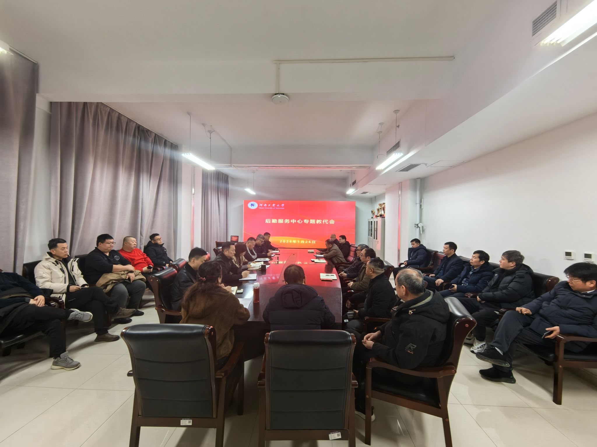 2026-01-27后勤服务中心召开专题教代会2026年1月26日下午,后勤服务中心在办公楼B108会议室召开专题教代会,就《河南工业大学后勤服务中心年终奖励性绩效分配方案》进行深入讨论和审议。中心教代会代表应到34人,实到28人,符合法定开会人数。会议由中心党委副书记、纪委书记宋文超主持。会上,中心党委书记张小彩详细传达了学校年终奖励性绩效分配方案及相关工作要求,明确学校层面的政策导向与基本原则,为方案制定提供明确依据。中心主任尹辉对《河南工业大学后勤服务中心年终奖励性绩效分配方案》... -